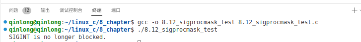 程序首先创建并初始化了一个信号集 set,然后将 SIGINT 信号添加到这个信号集中。接着使用 sigprocmask() 函数调用,通过 SIG_BLOCK 选项来阻塞 SIGINT 信号,并保存旧的信号掩码到 oldset 中。之后,使用 sigpending() 函数来检查 SIGINT 是否在待处理信号集中。最后,我们使用 sigprocmask() 函数调用,通过 SIG_SETMASK 选项来恢复原始的信号掩码,从而解除对 SIGINT 信号的阻塞。运行结果如下: