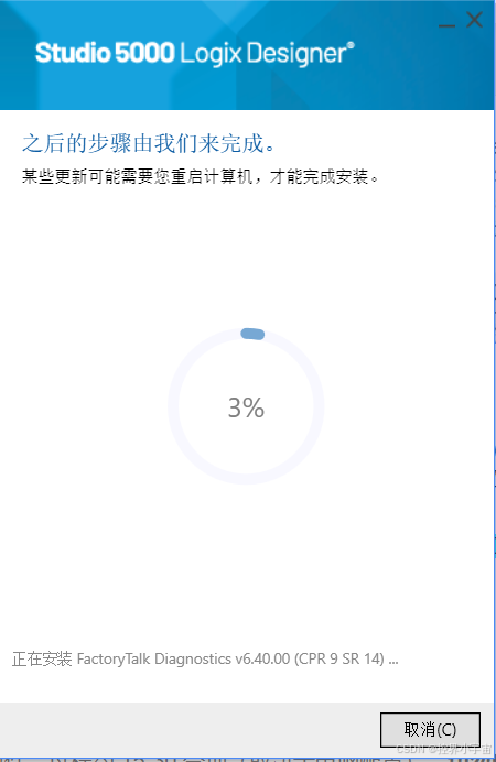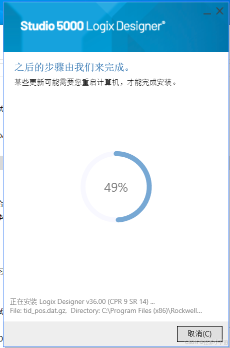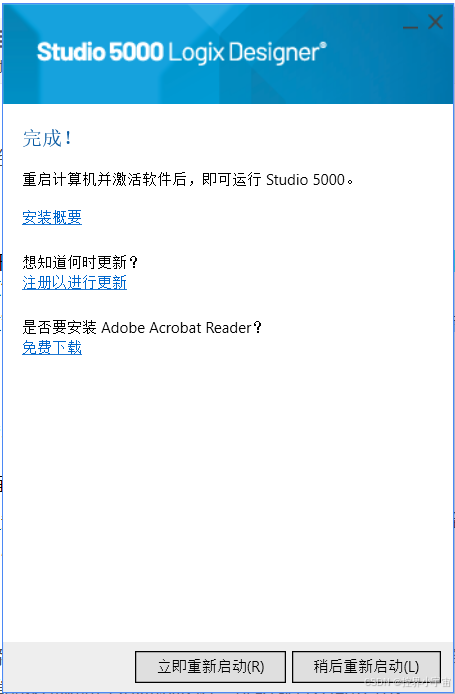 当进度条显示 “100%”,弹出 “安装完成” 界面,勾选 “启动 Studio5000-Web 许可证管理器”(后续激活需用),点击 “完成”,并按照提示重启电脑(让组件注册生效)。