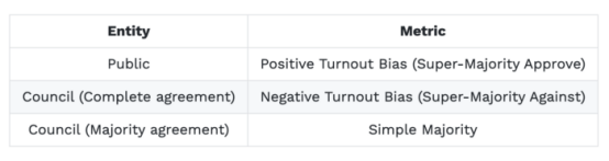 当提案通过与之相关的特定投票指标时,提案就会获得通过。根据谁提出的公投,决定了需要多少用户才能通过它们。你可以看到下面的表格,其中显示了提议公投的实体和定义需要多少用户投票才能通过公投的指标。