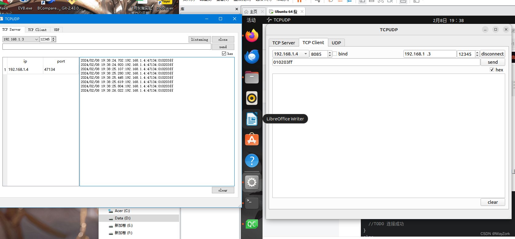 客户端由QTcpSocket实现,QTcpSocket继承自QAbstractSocket,比如上文中在虚拟机中建立一个tcp服务器,监听ip192.168.1.3,端口12345: