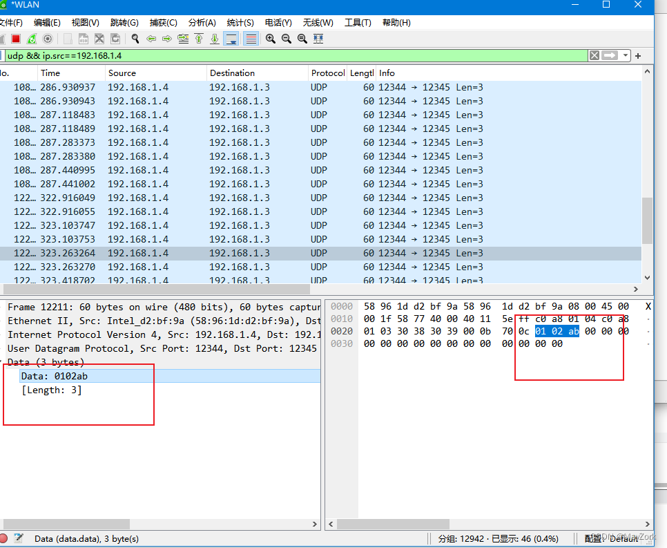 以上是使用调试助手,也可以使用WireShark抓包查看发送和接受的数据。需要注意的是如果客户端和服务器都在本地自己发自己收是用WireShark抓不到的。