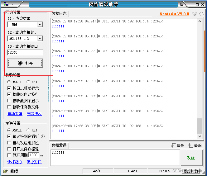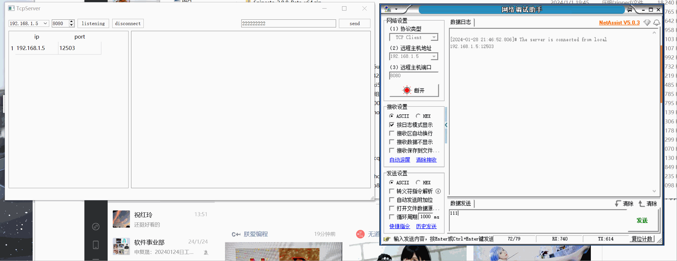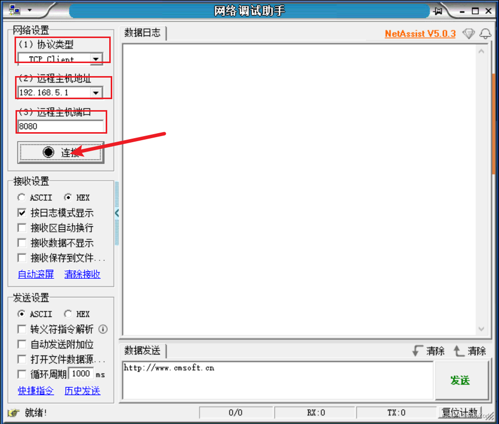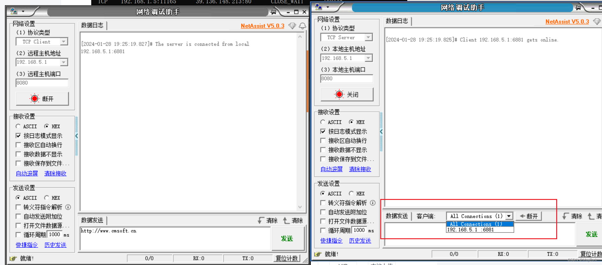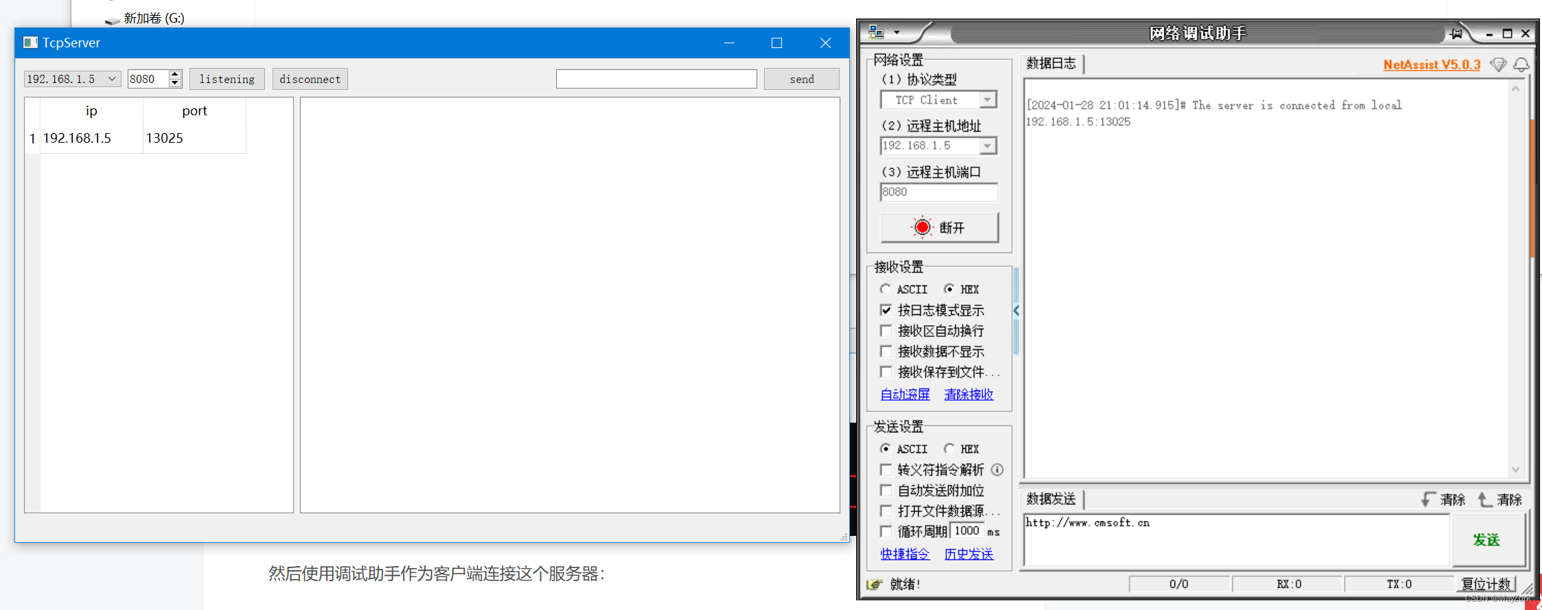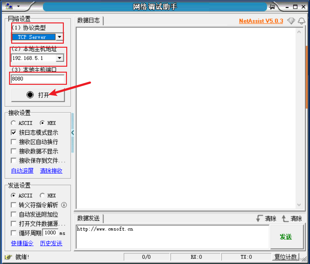 比如我使用刚刚的调试助手NetAssist,建立一个tcp服务器,然后监听IP:192.168.5.1,端口:8080。
