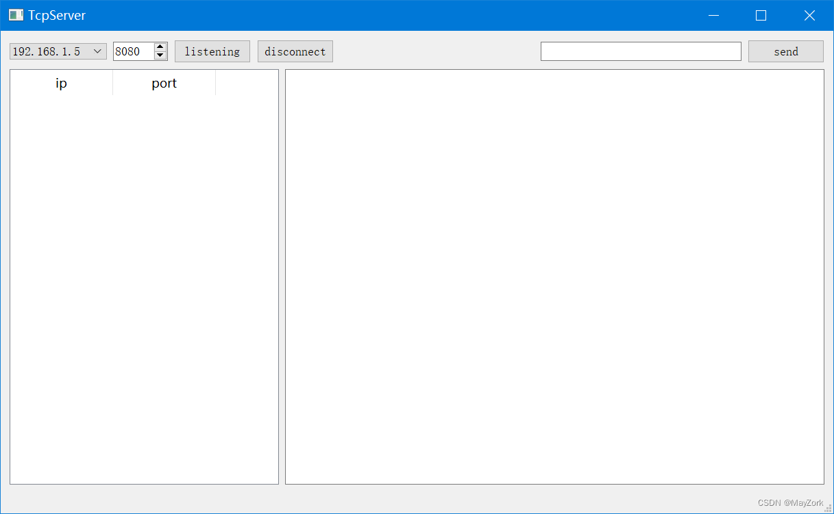 有客户端连接后,会触发newConnection这个信号,然后在槽函数中使用nextPendingConnection()这个方法获取对应的客户端QTcpSocket 指针对象。客户端发送消息后会触发readyRead这个信号,使用QTcpSocket的readAll获取发送的信息。编译运行,输入监听的ip和端口然后点击listen按钮然后使用命令查看是否开始监听对应ip和端口:
