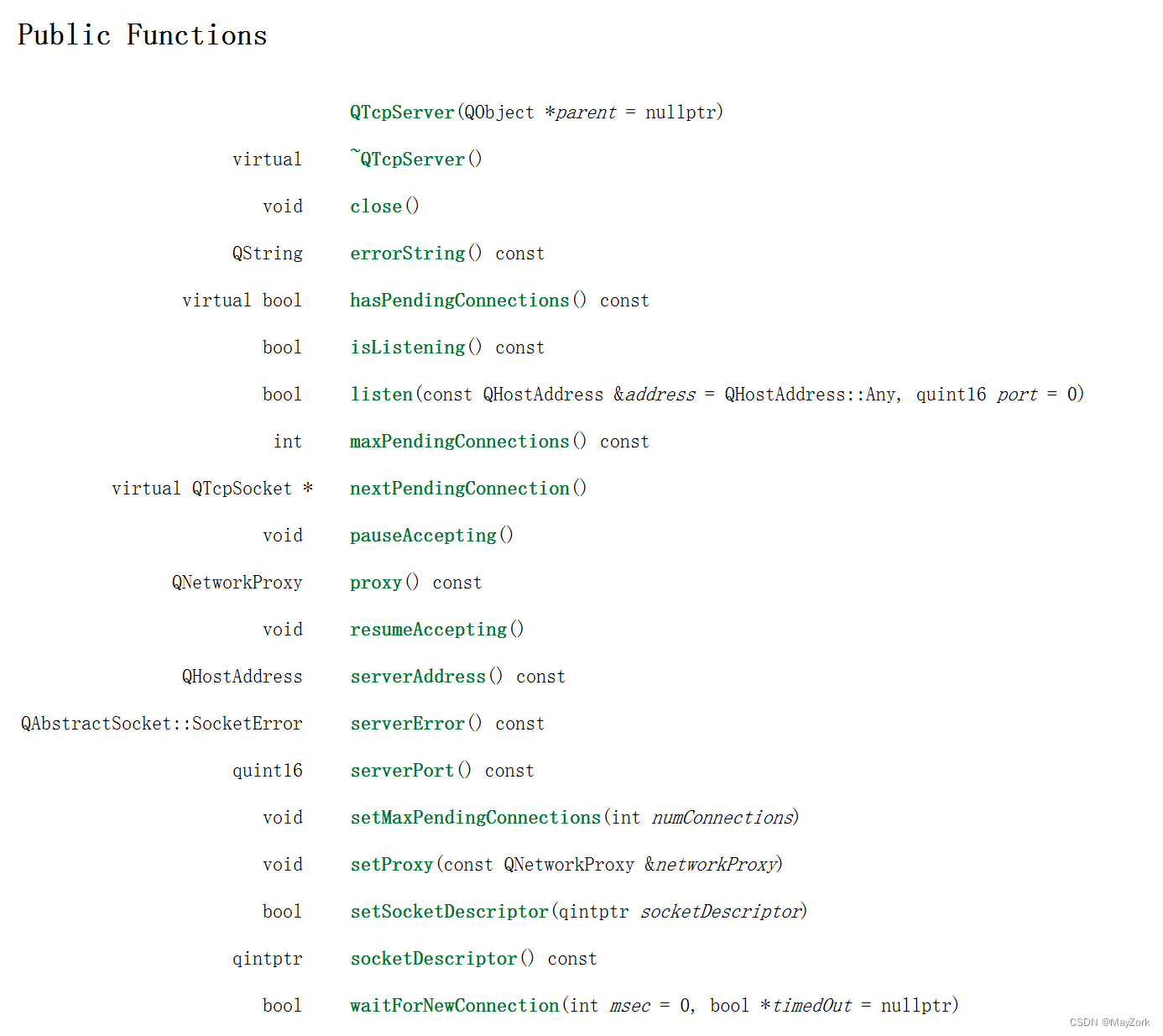 bool listen(const QHostAddress &address = QHostAddress::Any, quint16 port = 0) | 监听对应IP和端口,IP为空则默认监听any |