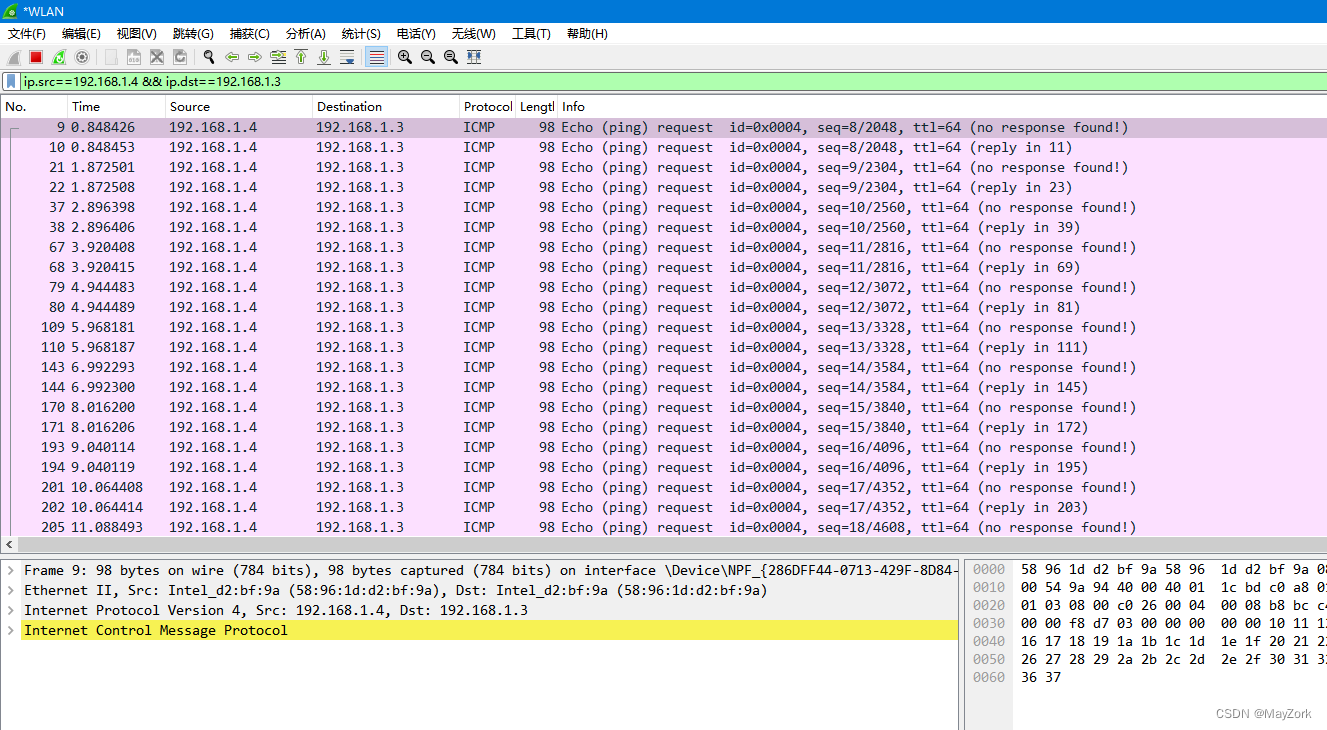 因为我的主机ip192.168.1.3,虚拟机ip是192.168.1.4,可以输入“ip.src==192.168.1.4 && ip.dst==192.168.1.3” 来过滤:
