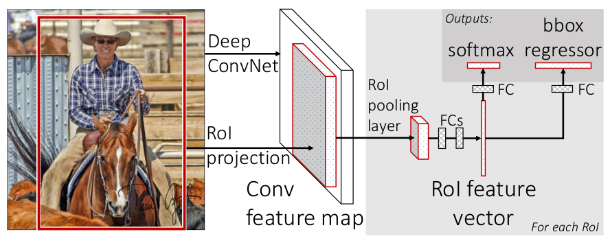 先把所有的图片的整个的投入用卷积和全连接,以产生卷积特征图,之后对于每个roi中的,提取固定长度的特征向量,每个特征向量也会被投入到一系列的的全连接层,最终进入到两个统计输出层:一个通过softmax来输出k个物体类别和1个背景类别,另一个层会输出针对所有k个类各自输出四个分数,这四个数值的含义是每个类的检测框位置的修正。