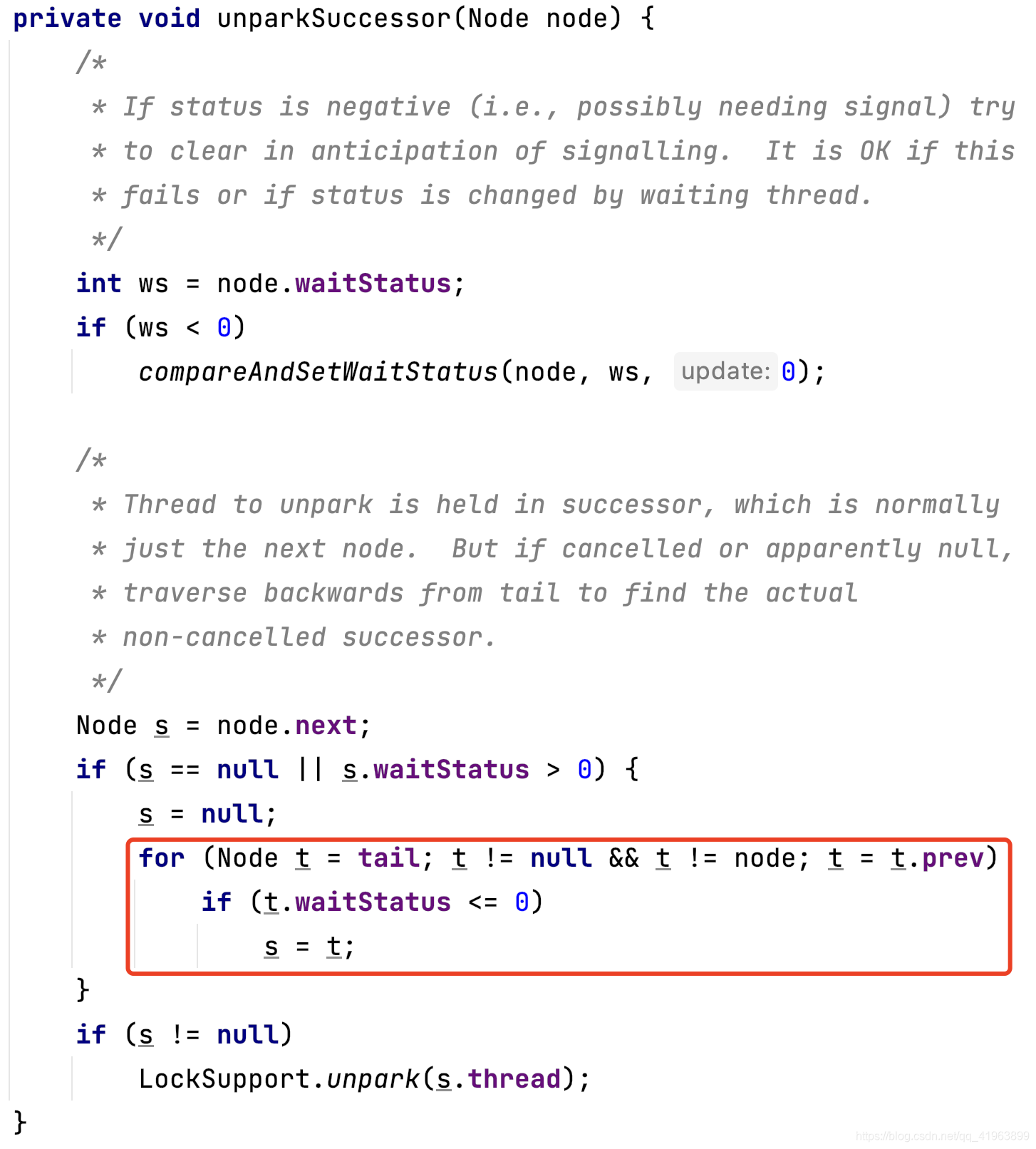 node为阻塞队列的头节点,s为头节点的后继节点,当后继节点为空或者后继节点的等待状态为CANCELLED时,则从阻塞队列的尾部开始一直往前找,找所有状态不是CANCELLED的节点,唤醒离头节点最近的节点线程。