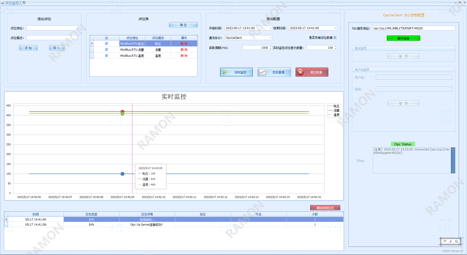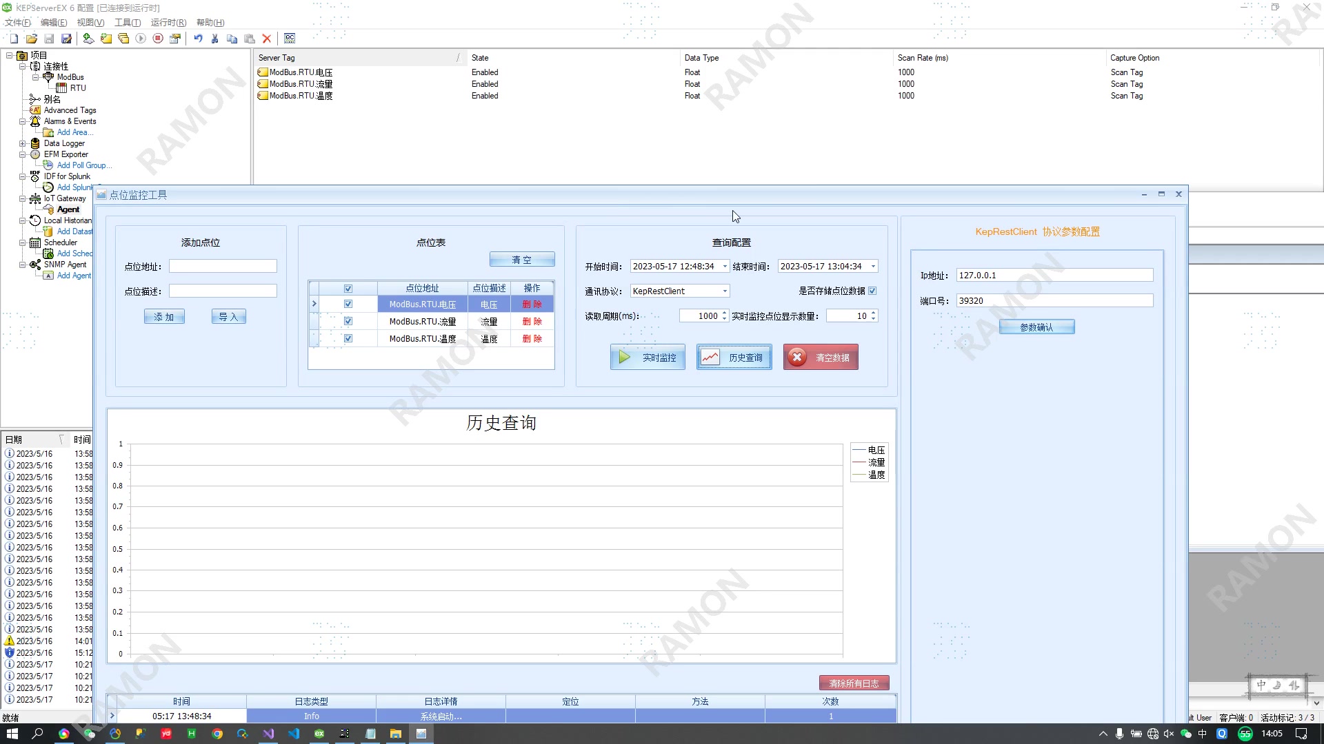 C# 利用KepServer,开发的工业设备点位曲线监控工具 由于项目调试需要,网上找了许久都没有找到一个合适的点位监控工具,于是利用KepServer中间工具开发了一套设备点位的监控工具,内部集成sqlite数据库,可实现小批量点位数据的历史缓存。后续有时间考虑集成各类PLC、ModBus、Mqtt等通讯协议,抛弃KepServer中间工具(🤔)。