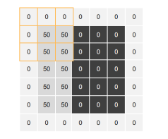 【第一步】:将滤波器”放到”图像左上角,将对应位置的值相乘后得到3x3的矩阵,再对矩阵内所有元素求和,得到第一个值【150】