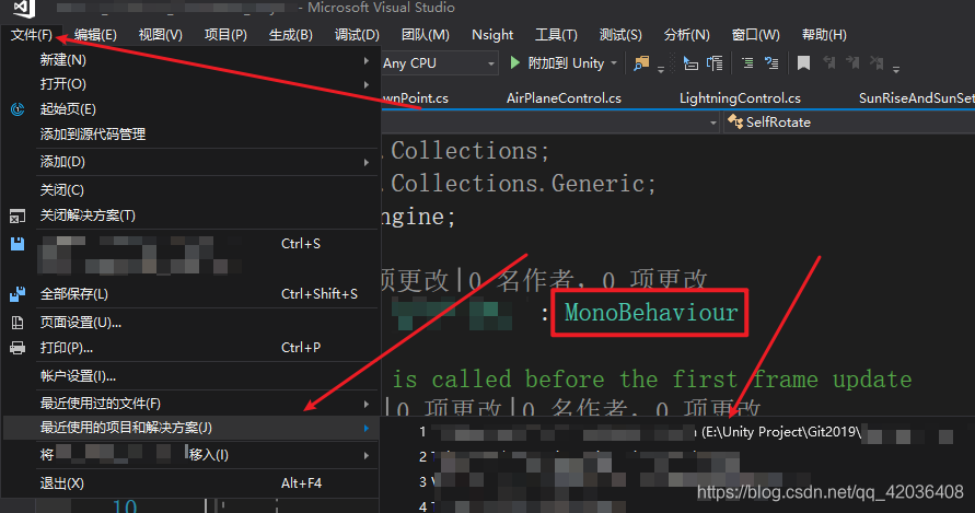 点击“文件”->“最近使用的项目和解决方案”->点击当前项目。即可瞬间重载当前项目,这个时候,白色的MonoBehaviour会变成绿色,就可以了。