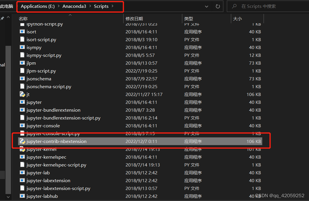 安装成功之后,请查看conda安装路径下是否有下图中的jupyter-contrib-nbextension.exe文件,亲测上述方法成功后是有该文件的,有一部分方法安装后会存在路径问题,很可能该路径下并没有此.exe文件,则不能进行后续激活操作。