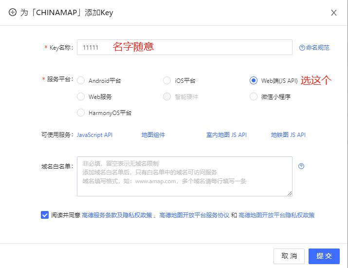 key: 'your key',//api服务key--另外需要在public中使用安全密钥!!!