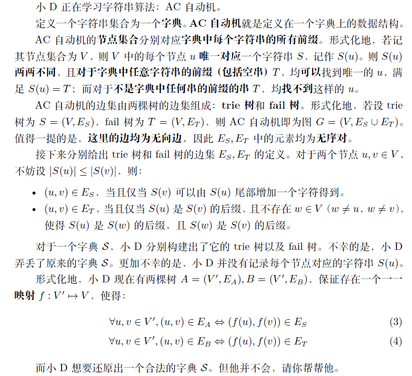 2021/7/22 update\tt 2021/7/22\;update2021/7/22update:忽然想起,给出 trie\tt trietrie 树建 AC\Bbb{AC}AC 自动机的时间复杂度是有问题的!复杂度可达到叶子节点的深度和!扫把形的图就会卡成 Θ(n2)\Theta(n^2)Θ(n2) 了!糟糕的出题人和糟糕的验题人(如果有)。