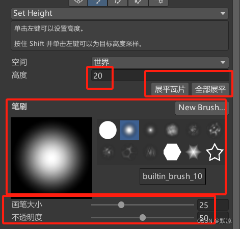 地形创建:在层级中右键创建地形。 当前视角同步到相机(对齐视图):Ctrl + shift + F 注意:需要选中摄像机 太大了,调小一点。 高或低的平面 洞 山脉 Shift + 左键 是降低。 地形纹理绘制 绘制树 绘制草