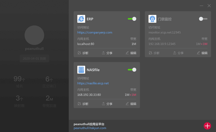 简介:基于ngrok的国内收费内网穿透工具,类似花生壳,有免费版本,比花生壳好。免费版本:提供http,https,tcp全隧道穿透,随机域名/TCP端口,不定时强制更换域名/端口,自定义本地端口