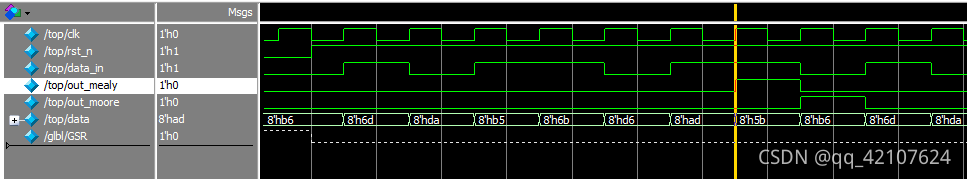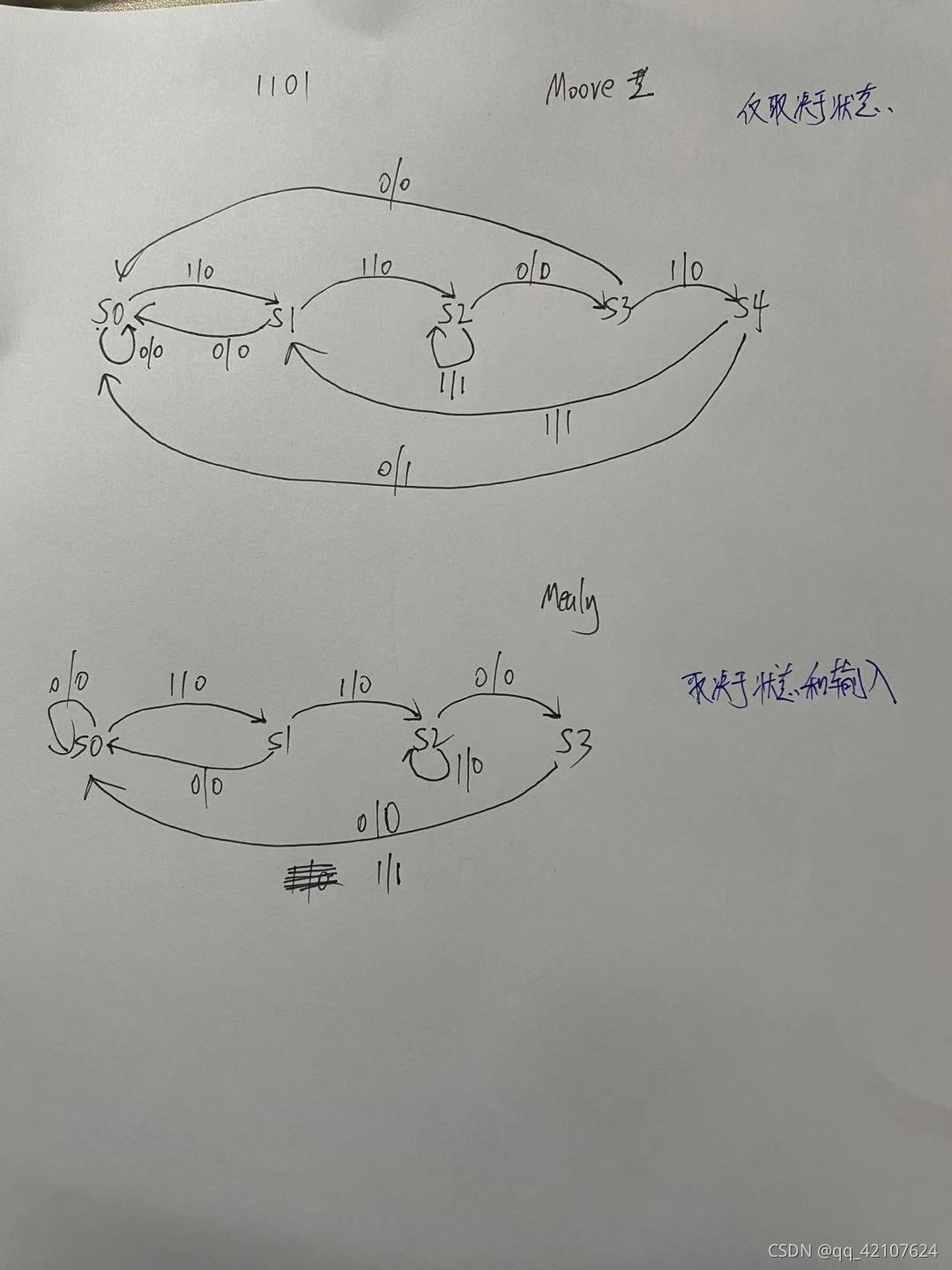 Moore:1101输入最后一个1的上升沿时,n_stata为s4,经过下一个上升沿后,c_stata为s4,再经过输出触发器的同步之后,下一个上升沿输出为1