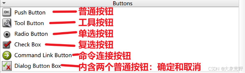 Dialog Button Box是特殊组合(两个QPushButton水平排列),非单一新控件。