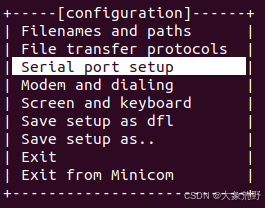 打开终端,输入sudo minicom -s命令,进入Minicom的配置界面。 -