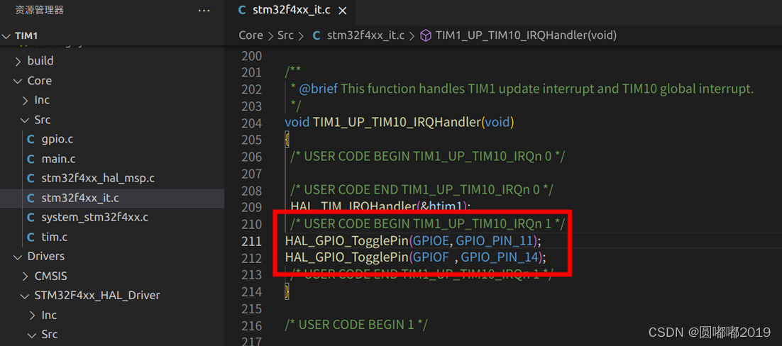 中断触发后就会执行这个函数 HAL_TIM_IRQHandler(&htim1),这个函数将定时器初始化,重新开始计数。