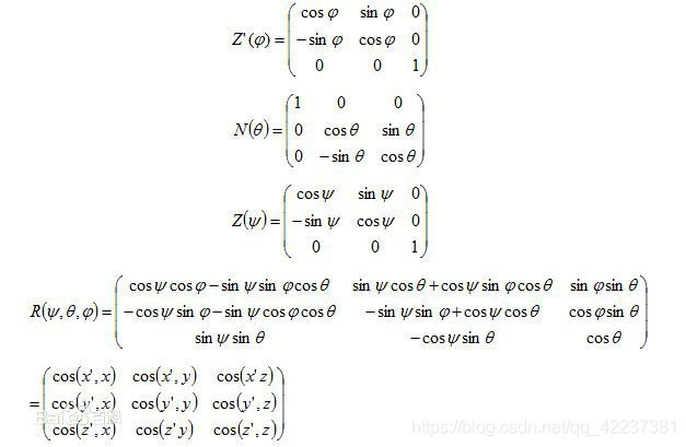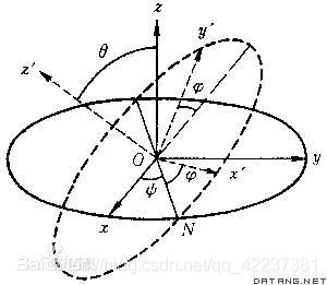 若令Ox'y'z'的原始位置重合于Oxyz,经过相继绕Oz、ON和Oz'的三次转动Z(ψ)、N(θ)、Z'(φ)后,刚体将转到图示的任意位置(见刚体定点转动)。变换关系可写为:
