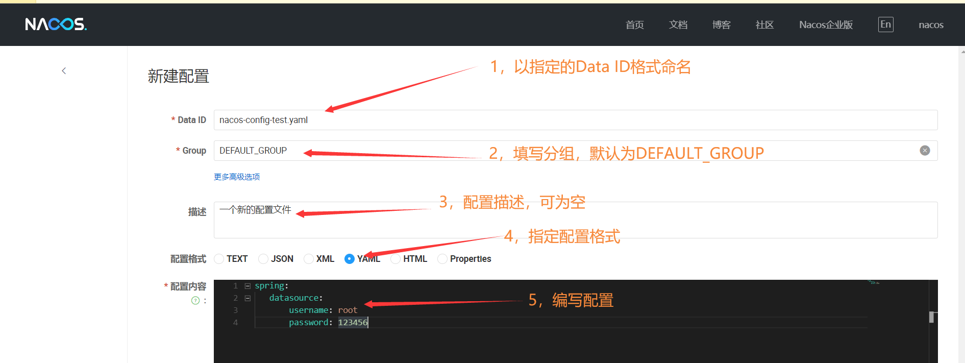 file-exetension 为配置内容的数据格式,可以通过配置项 spring.cloud.nacos.config.file-extension 来配置。目前只支持 properties 和 yaml 类型。