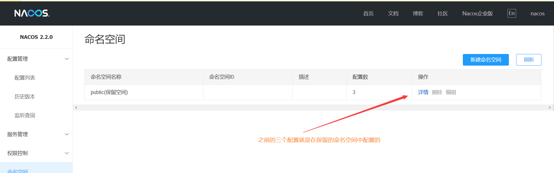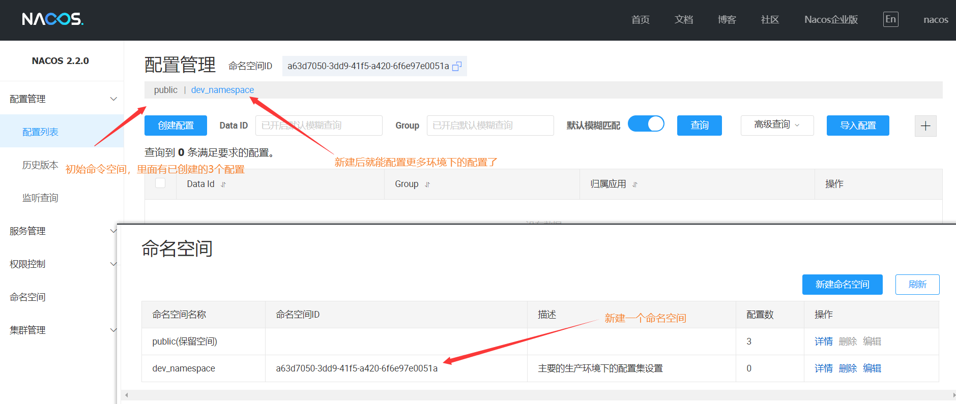 除此以外,nacos还提供了命名空间(namespace)来使用,命名空间用于进行租户粒度的配置隔离。不同的命名空间下,可以存在相同的 Group 或 Data ID 的配置。Namespace 的常用场景之一是不同环境的配置的区分隔离,例如开发测试环境和生产环境的资源(如配置、服务)隔离等。