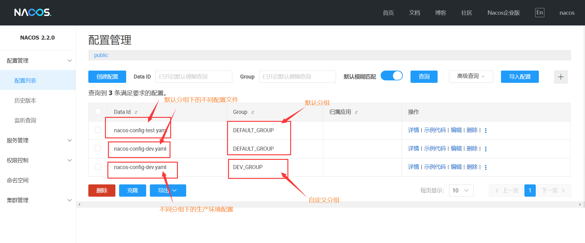 这里能注意到nacos可以使用Data ID和Group来区分不同配置。