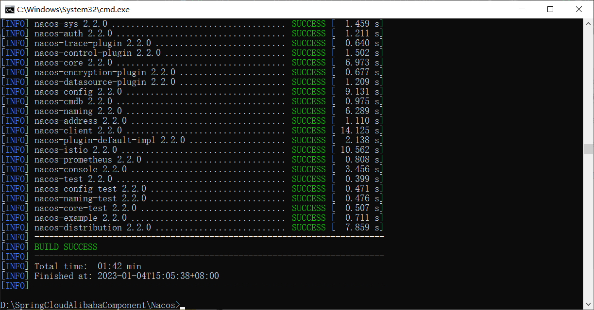 然后进入我们下好的Nacos文件中,通过maven对Nacos源文件进行打包。时间可能相较于前面克隆下载Nacos源文件较长,但是比去官网下载要好得多。
