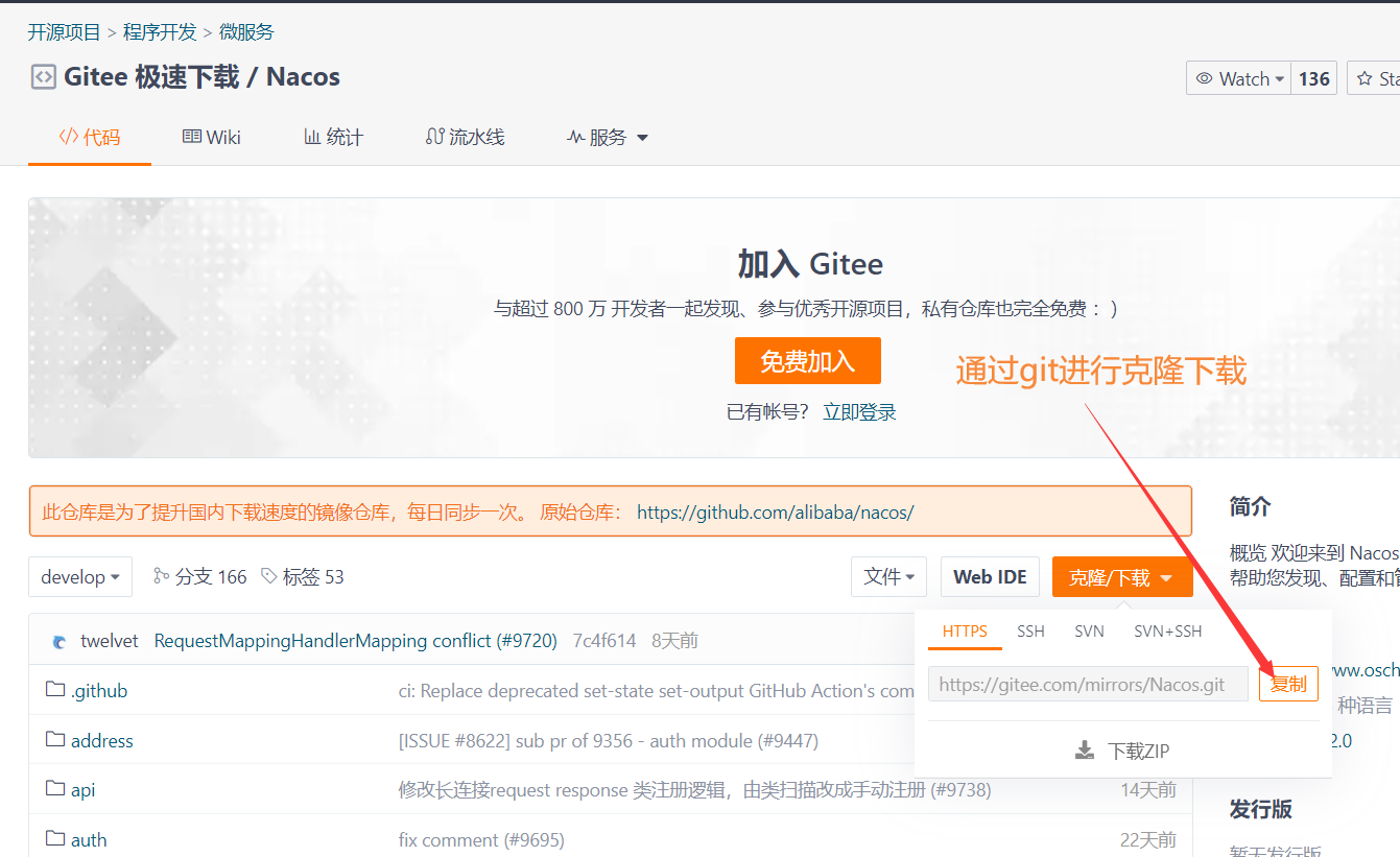1,进入gitee中Nacos的国内镜像仓库去下载Nacos源文件,仓库地址为:Nacos国内镜像仓库