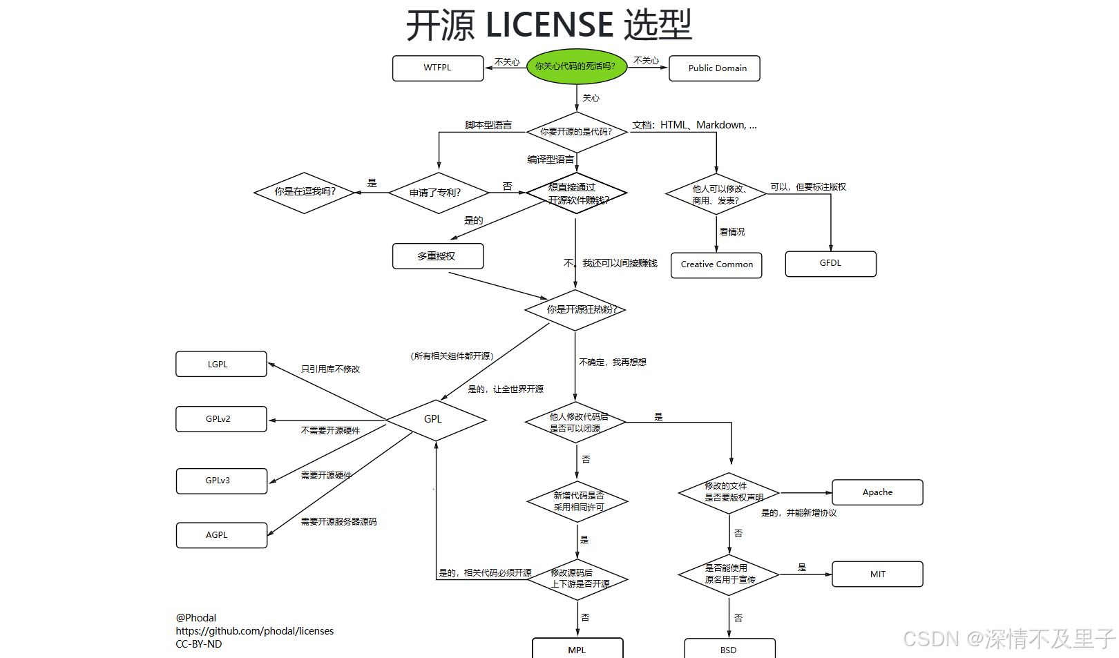 除此以外,如果大家想拥有一个完整严密的开源协议决策链,也可以参考 Github 上 phodal 大神分享的这个流程图,大家可以配合上面梳理的内容,去进行合理选择~
