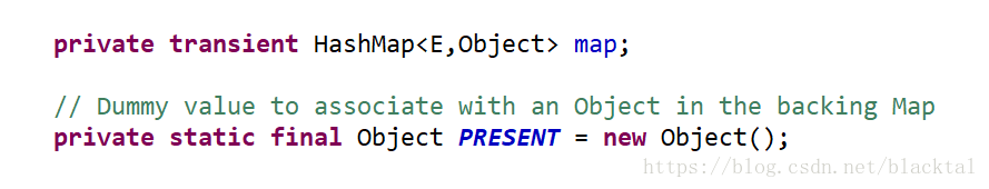 HashSet是基于HashMap实现的,默认构造函数是构建一个初始容量为16,负载因子为0.75的HashMap。封装了一个HashMap对象来存储所有的集合元素,所有放在 HashSet中的集合元素实际上由 HashMap的key来保存,而 HashSet中的 HashMap的 value则存储了一个static、final类型的空对象。