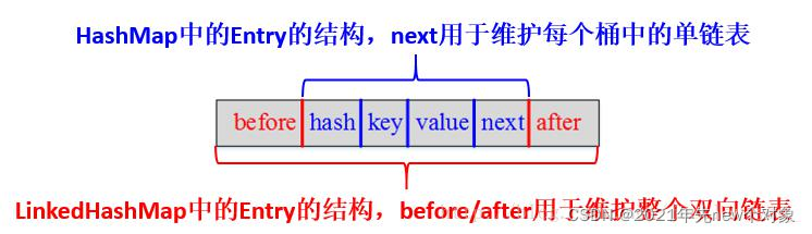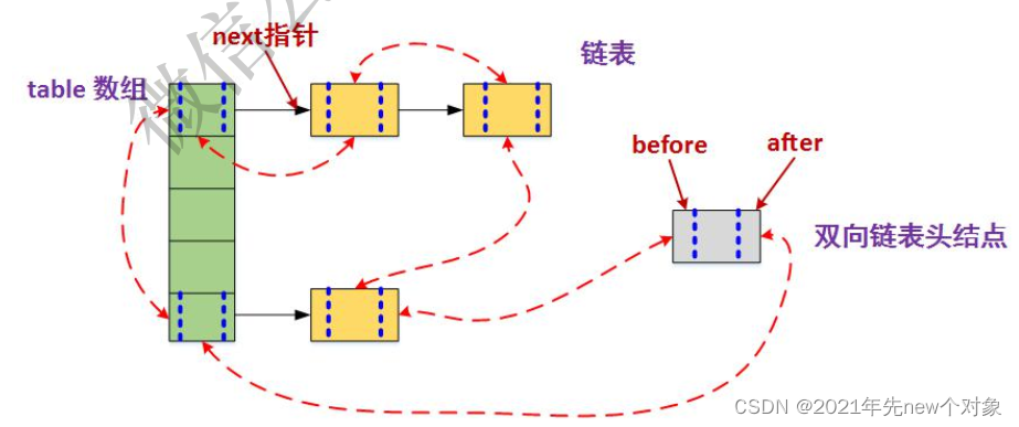 Entry 都保存在哈希表中, 但由于它又额外定义了一个以 head 为头结点的双向链表, 因此