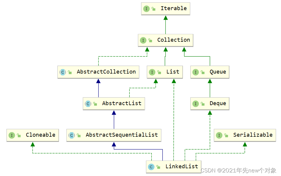 |——————├ LinkedList,实现类,适应于写多的场景,线程不安全