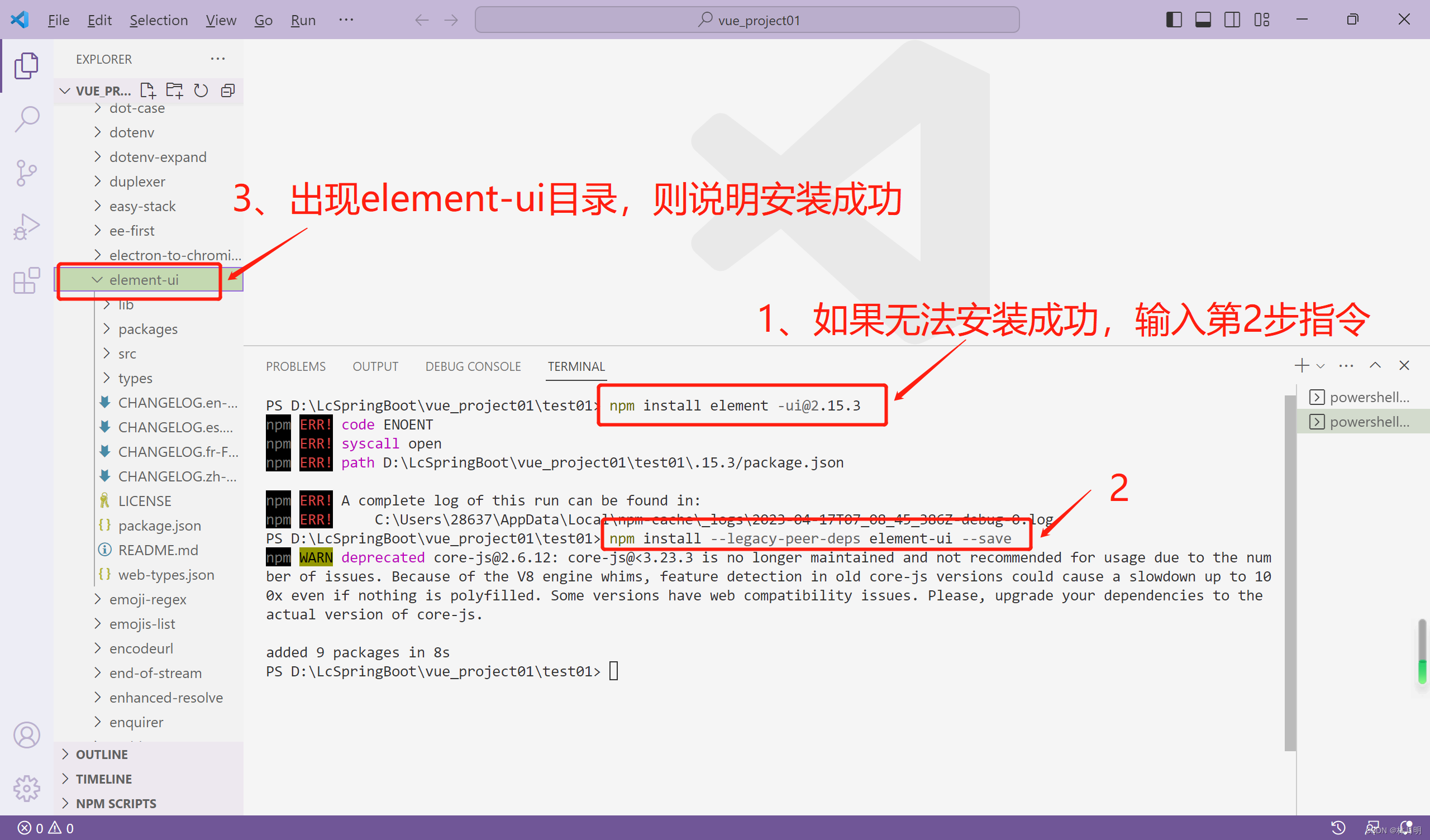 1、安装Element UI组件库,在当前目录下,在命令行执行指令:
