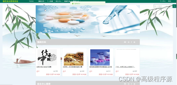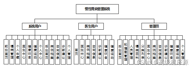 (1)功能要求:首页,网站管理(轮播图),人员管理(管理员,系统用户,医生用户),内容管理(慢病百科,分类列表),模块管理(医生中心,病例档案,咨询信息,诊断建议,健康饮食,健康运动),个人管理等功能模块。