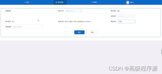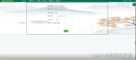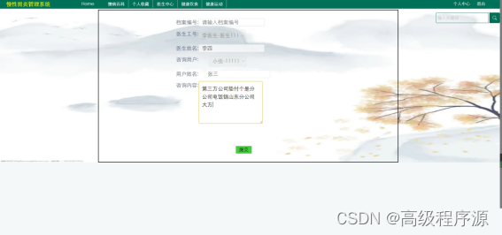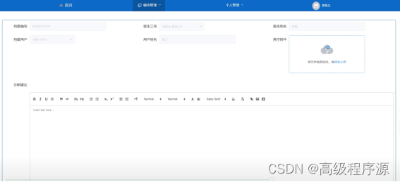 系统用户后台:首页,模块管理(病例档案,咨询信息,诊断建议),个人管理等功能,如图5-11,12所示。