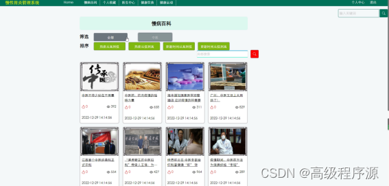 慢病百科,系统用户在此页面查看管理员发布的百科文章,可以进行搜索,点赞,收藏,评论等操作,按照不同的需求进行排序,如图5-13所示。