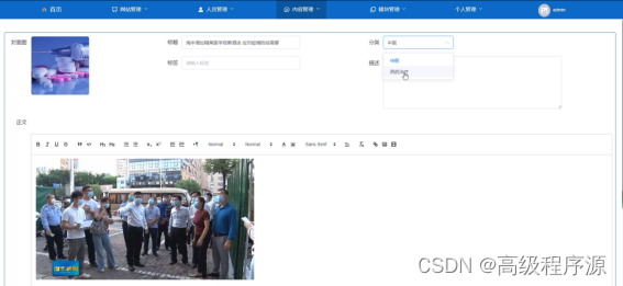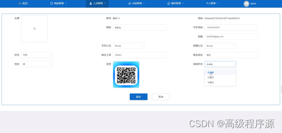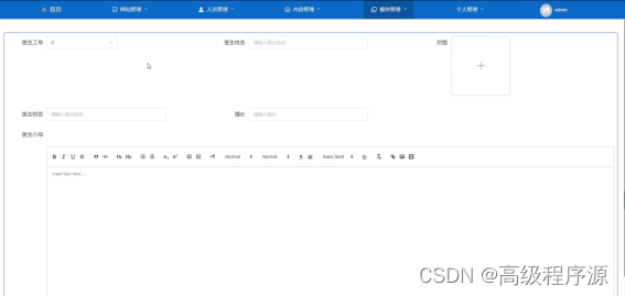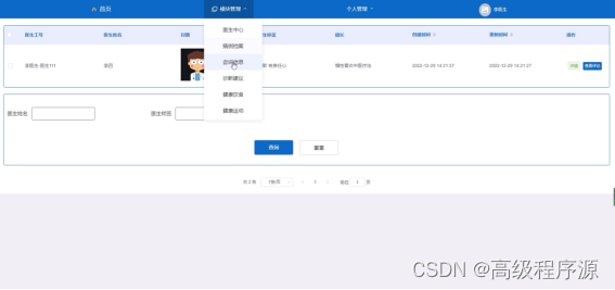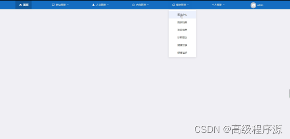 3、功能的完善性:拥有首页,网站管理(轮播图),人员管理(管理员,系统用户,医生用户),内容管理(慢病百科,分类列表),模块管理(医生中心,病例档案,咨询信息,诊断建议,健康饮食,健康运动),个人管理等模块的修改维护操作。