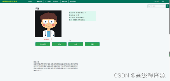 医生中心,系统用户在此页面可以搜索并选择医生进行病历上传,问诊咨询,点赞,收藏等操作,如图5-14,15,16,17所示。