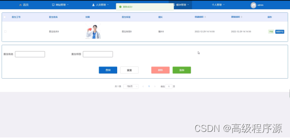 医生中心:管理员审核通过医生的注册申请后,将医生信息更新至医生中心后用户方可在前台查询到该医生。如图5-4所示。