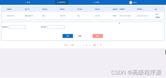 人员管理,在此管理页面可以查看系统用户和医生的相关信息,还可在该页面对用户进行重置、添加和删除等操作,医生需由管理员审核。如图5-3所示。