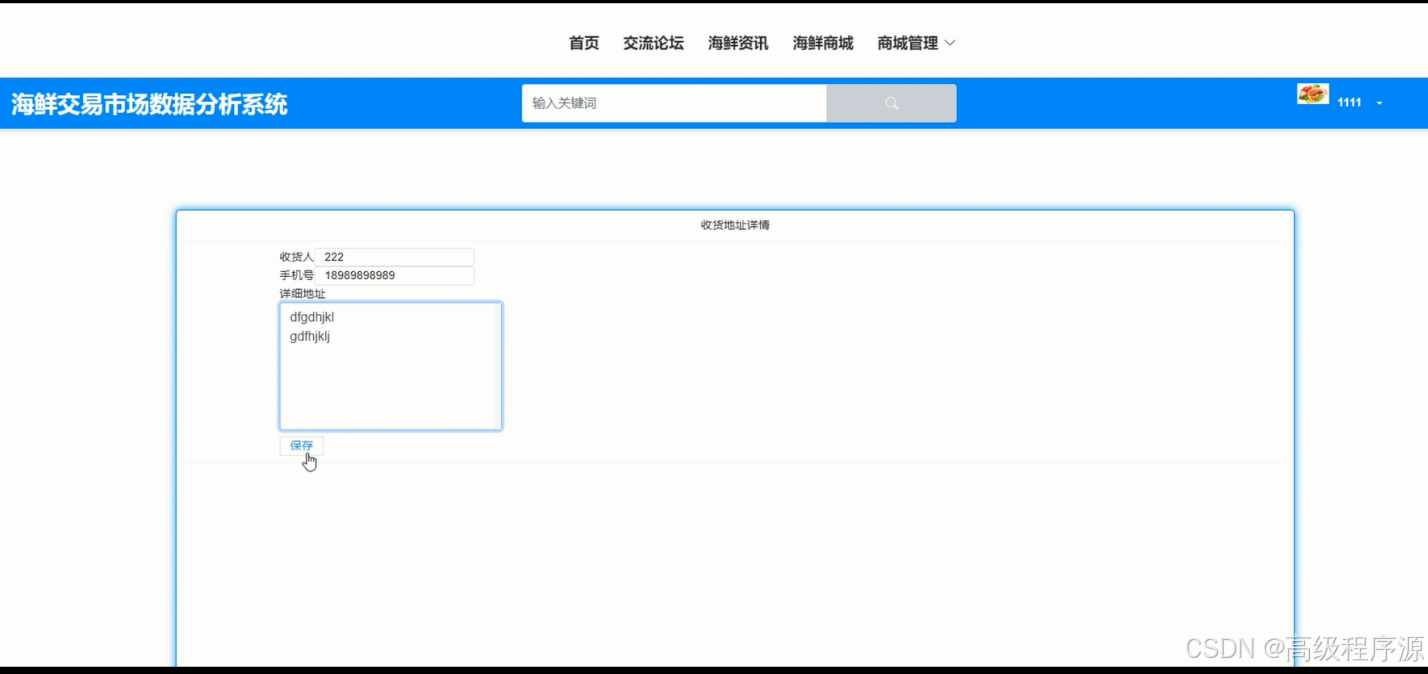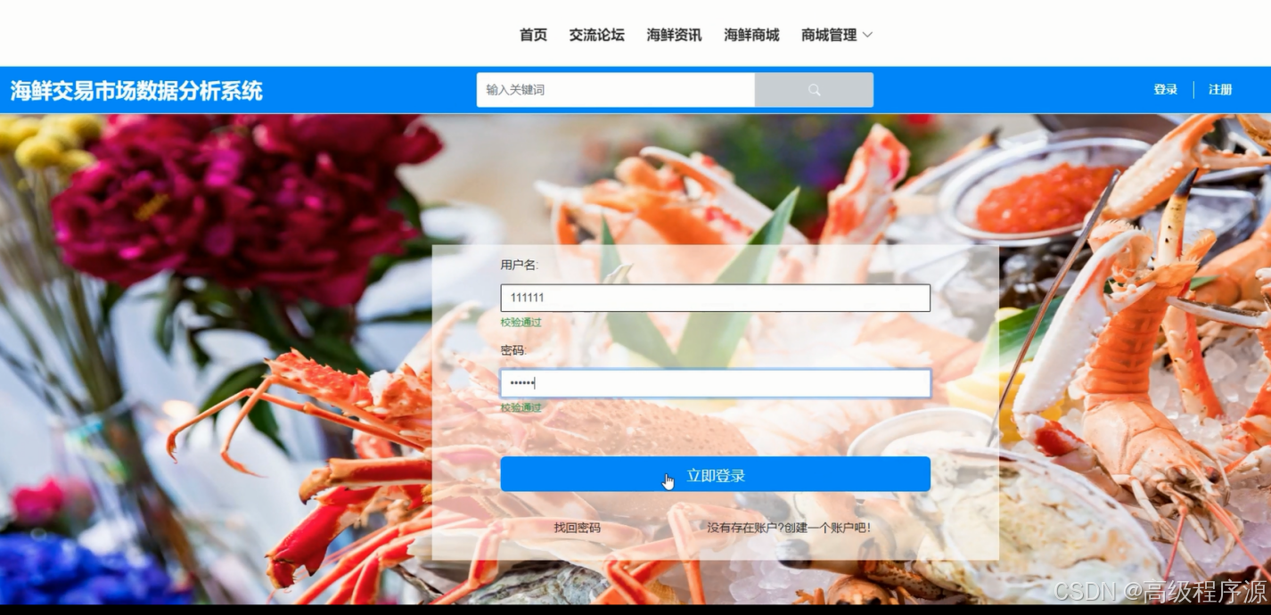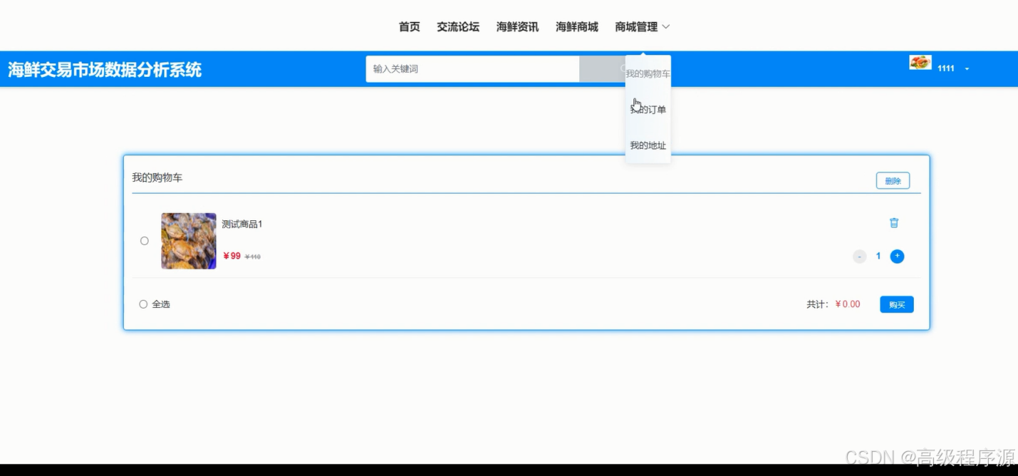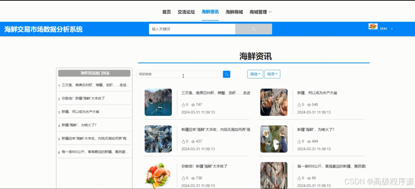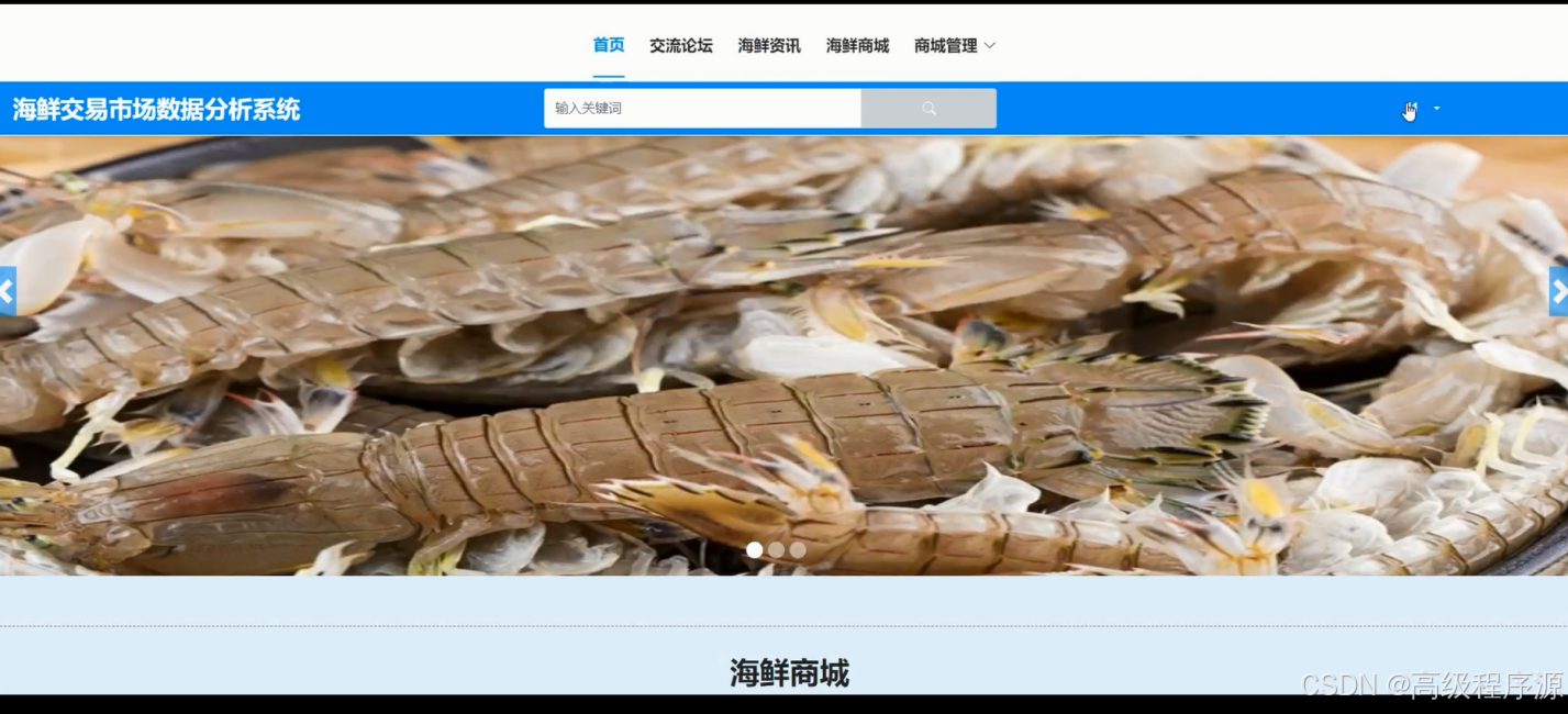 首页:展示海鲜交易市场数据分析系统的主要信息和功能入口,包括海鲜资讯、海鲜商城等内容,让用户快速了解市场动态和购物选项。