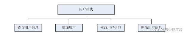 本系统的用户包括后台管理员和前台用户,两个模块的功能基本是相同的,用户比管理员多了一个注册功能,所以以用户模块的结构图为例进行分析,用户模块结构图为例进行分析,如下图: