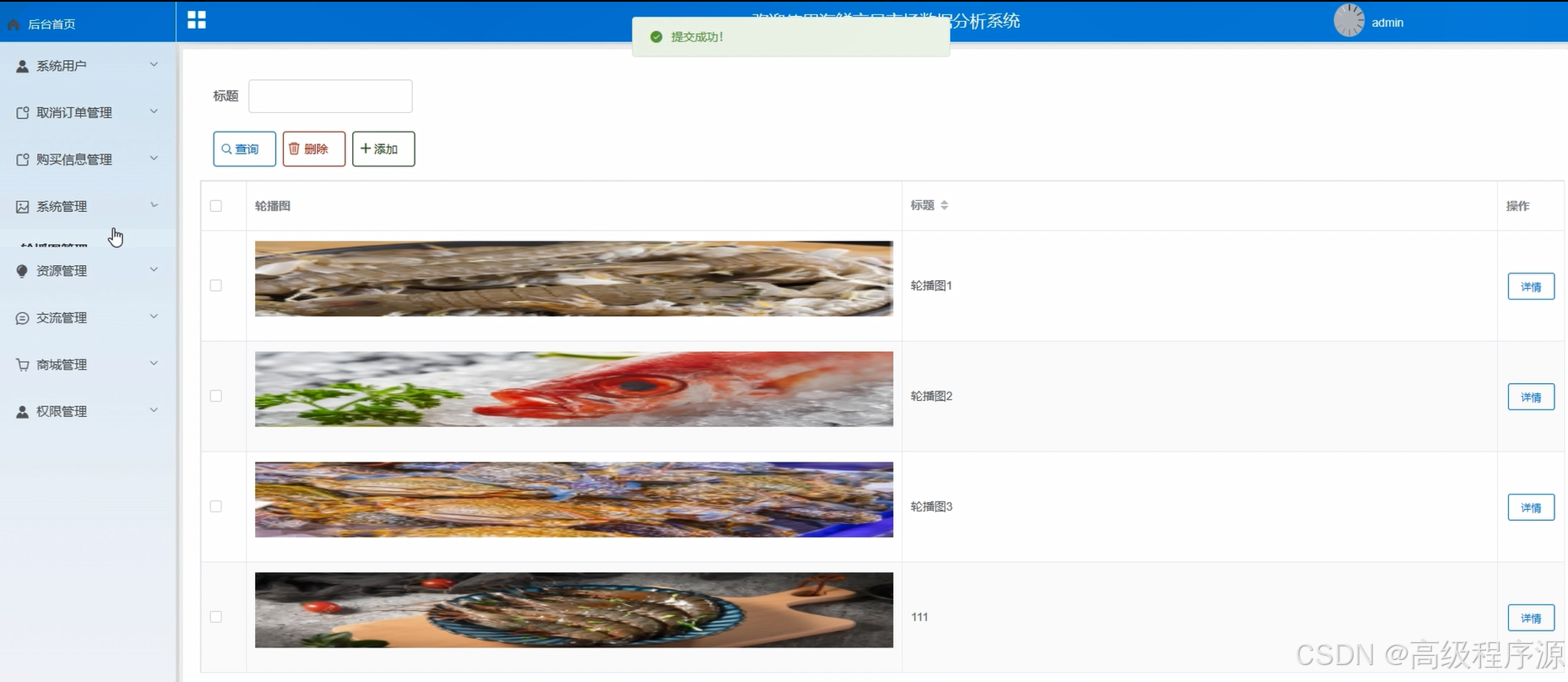 基于Hadoop的海鲜交易市场数据分析系统中的管理人员在“系统管理”这一菜单下是可以对基于Hadoop的海鲜交易市场数据分析系统内的轮播图进行添加修改的,其管理界面如下图所示。