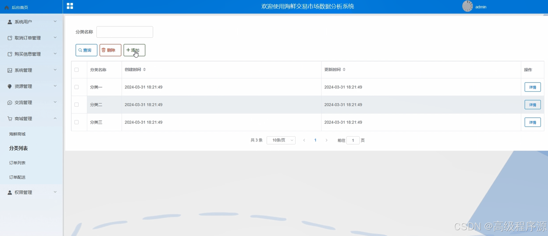 管理员可以管理商品的分类信息,包括添加、编辑、删除分类等操作,以便用户浏览和搜索商品。分类列表界面如下图所示。