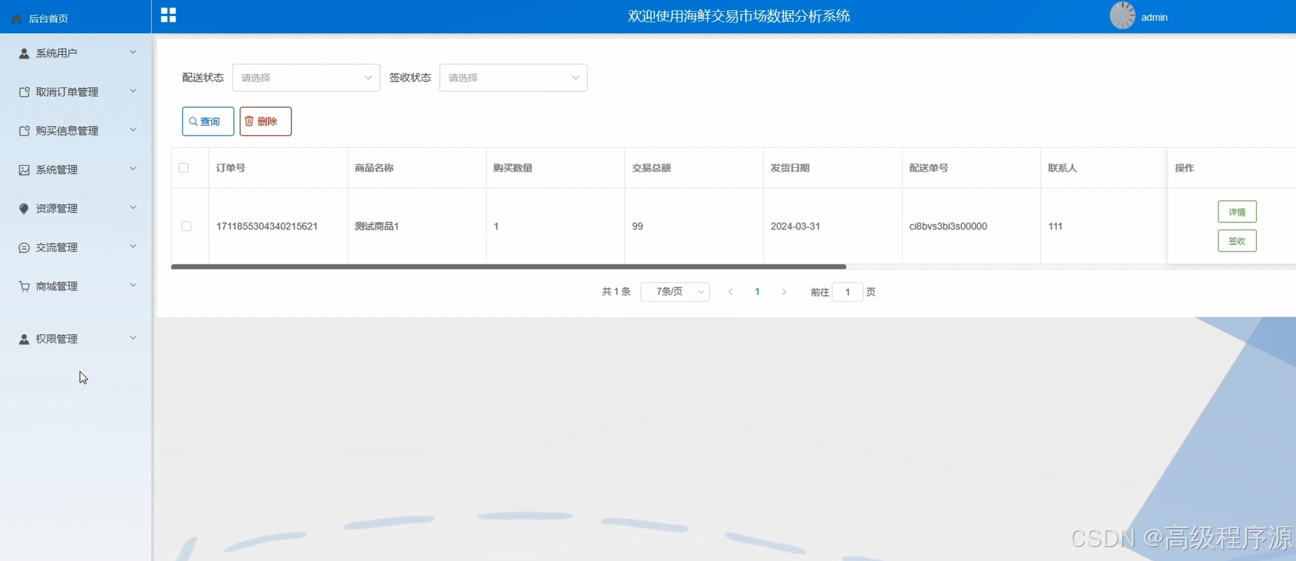 管理员可以管理订单的配送情况,包括查看订单的配送状态、更新配送信息等,以确保订单的及时送达。界面如下图所示。