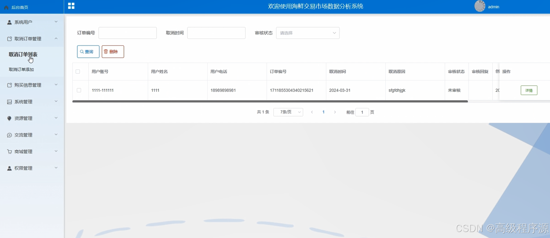 管理员点击“取消订单管理”会显示取消订单列表和取消订单添加这两个子菜单,支持输入订单编号、取消时间审核状态进行查询和添加的操作。可以对客户取消订单进行审核。取消订单列表界面如下图所示。
