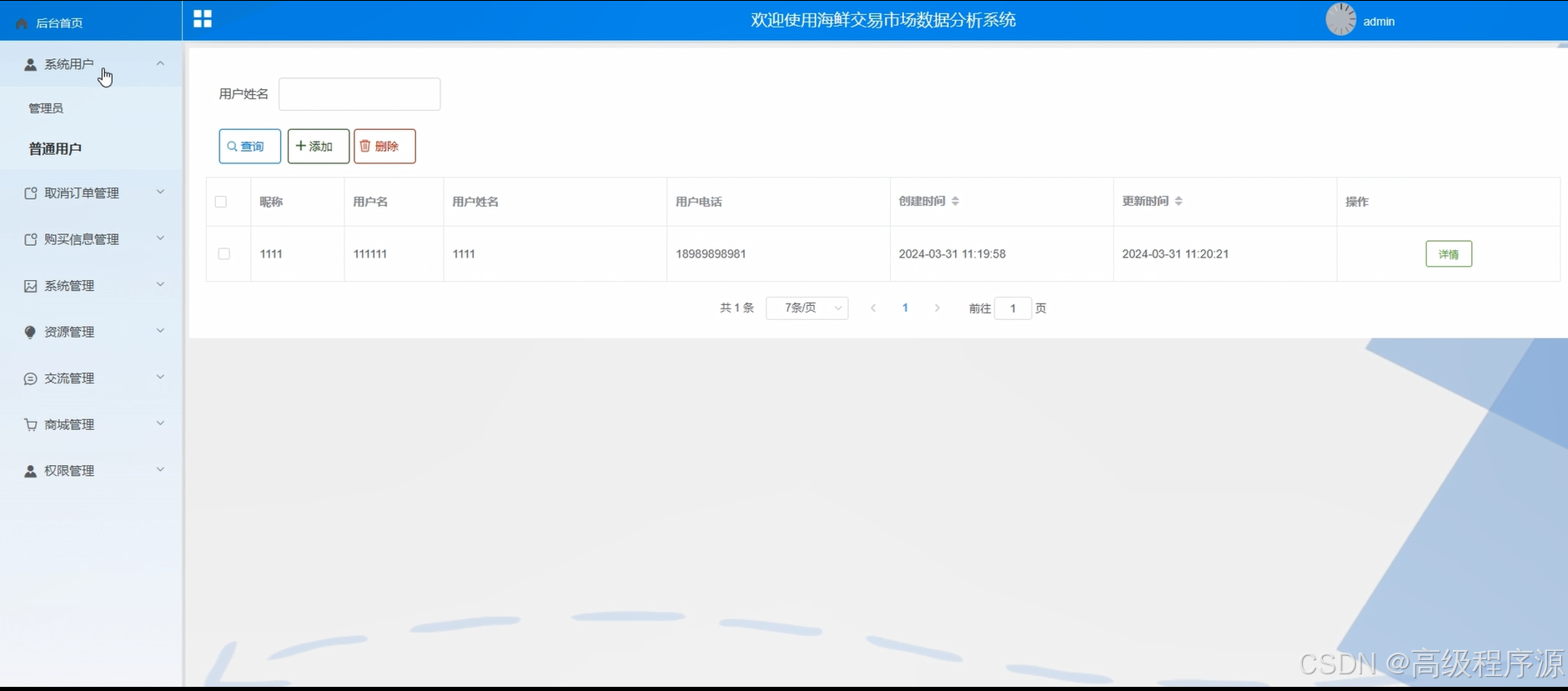 基于Hadoop的海鲜交易市场数据分析系统中的管理人员在“系统用户”这一菜单是中可以对管理员、普通用户进行管控。界面如下图所示。