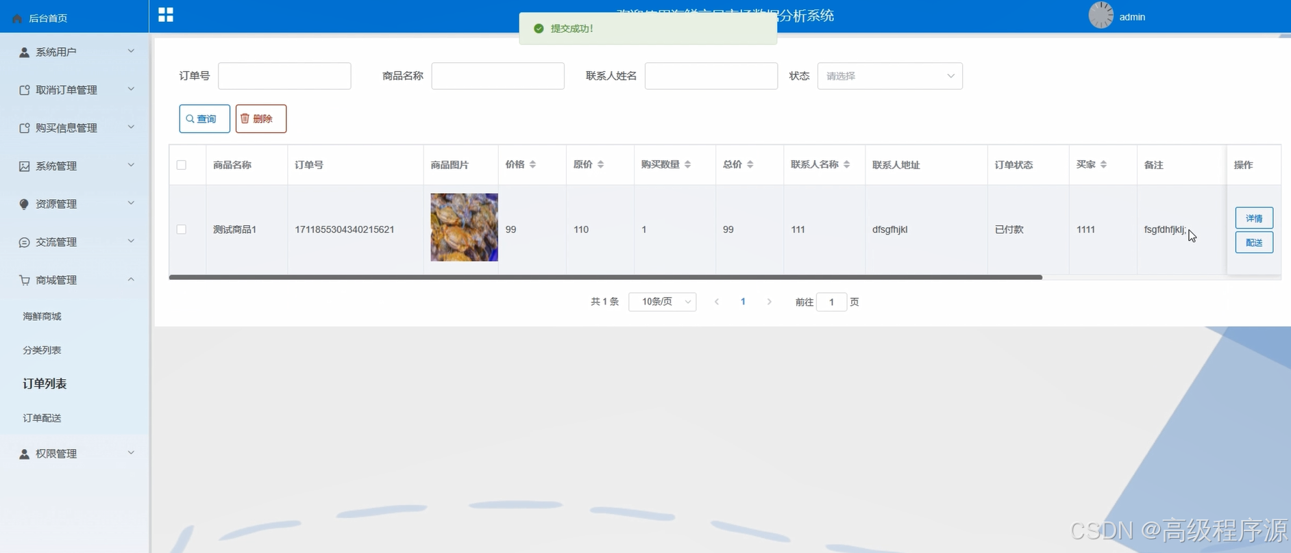 管理员可以查看和管理用户的订单信息,包括订单状态、付款情况等,以保证订单的顺利处理和配送。界面如下图所示。