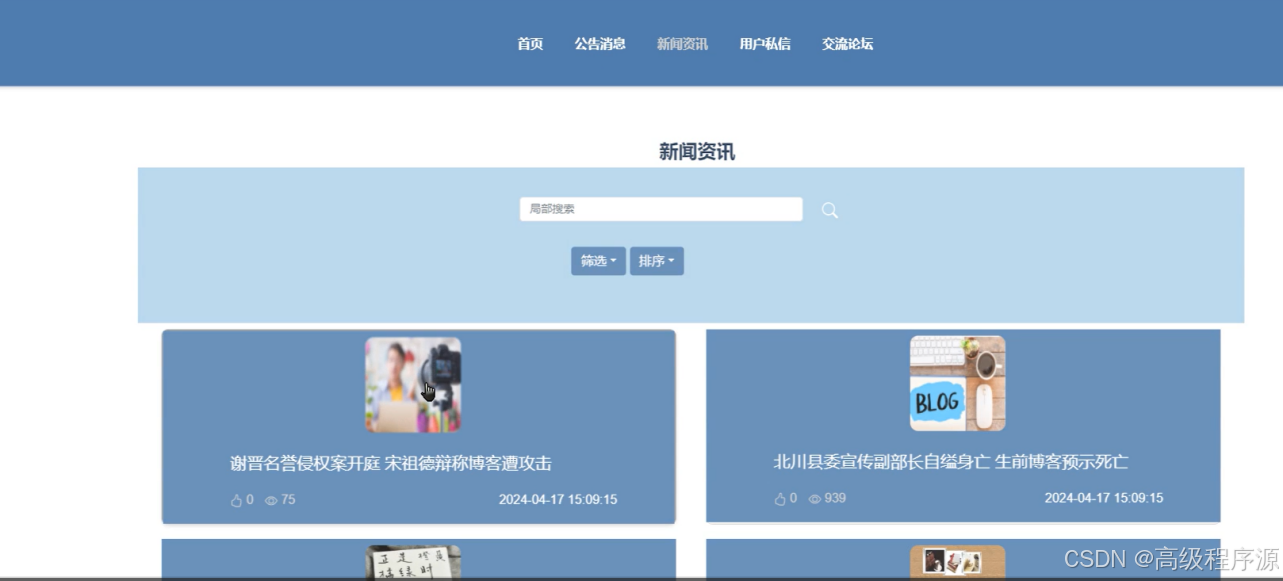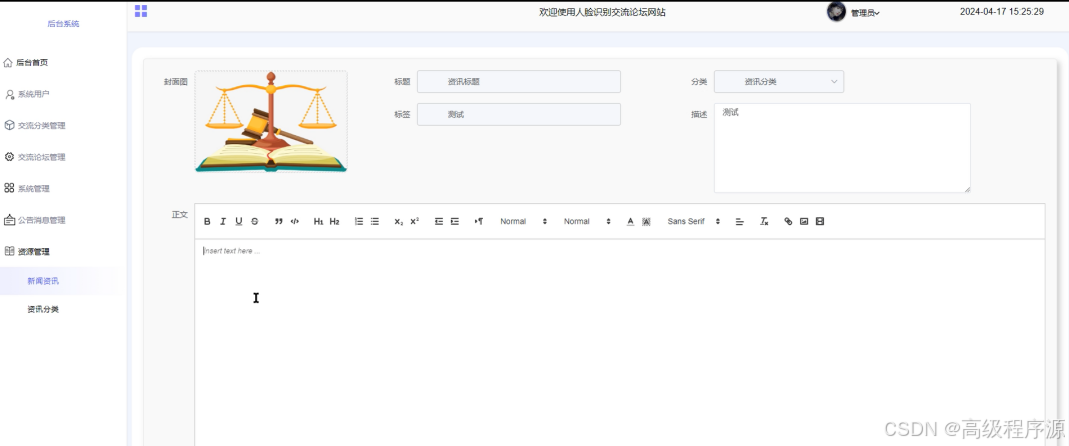 - 资源管理:管理员可以对网站的资讯列表、资讯分类进行管理,包括添加题目、修改、删除等操作。